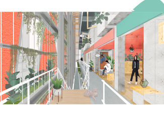 We create a transit-oriented linear block by using a methodology that incorporates the percentage of household sizes and culture groups on site to design a variety of household configurations from simple room units. The walls, doors and windows allow for varying visual privacy and opportunities for chance contact. They form blocks of communities placed on an elevated datum of public space with ramps and sky bridges connecting them to the station and surrounding context. A double-skin façade is placed facing the station to create a noise barrier that doubles as circulation space. Voids are punctured through the block connected to a secondary circulation that functions as a social corridor facing the neighbourhood on site. All circulation corridors are naturally-ventilated and living spaces are daylit, reducing the time spent in enclosed spaces and transmission possibilities.